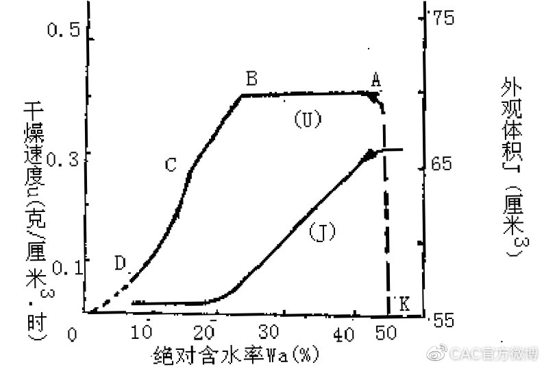 上圖中A-B就是等速干燥階段,此時(shí)水分自生坯外表面的連續水膜蒸發(fā),內部水分不斷補充,內、外擴散速度相等,干燥速率固定不變。隨著(zhù)含水率降低,顆粒在水的表面張力作用下被拉近,生坯逐漸收縮,收縮的體積相當于排除水的體積,因此該階段應使生坯表面溫度均勻、不變。