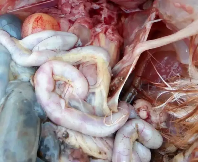 解剖癥狀:打開(kāi)腹腔一股刺鼻的味道,有部分雞的腸道會(huì)隨著打開(kāi)的腹腔及時(shí)沖到體外,腸道充氣,剪開(kāi)腸壁變薄。有的雞的腸道有一層麩皮樣附著在腸壁上,腸內(nèi)有黃色或者是肉色的內(nèi)容物,在腸道的后三分子一處有脫落的腸黏膜,盲腸有黑或者是紅色的物質(zhì)。