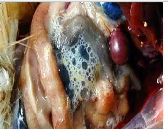 大多數(shù)情況下,氣囊炎不是一個(gè)單獨(dú)的疾病,僅僅是某些全身性感染的癥狀。臨床上最常見的是大腸桿菌感染引起的氣囊炎:病雞精神沉郁,呼吸困難,有啰音,咳嗽。剖檢可見氣囊混濁,有大量混濁的滲出液,重者氣囊壁增厚,有大小不等的干酪樣凝塊。除大腸桿菌外,新城疫病毒、傳染性法氏囊炎病毒、傳染性支氣管炎病菌、傳染性鼻炎病毒、支原體、曲霉菌等病原微生物,感染肉雞后,都可以引起氣囊炎?梢哉f,引起氣囊炎的病原十分復(fù)雜,臨床治療若沒有明確的目標(biāo),判斷不準(zhǔn)病原,選不準(zhǔn)有效藥物,很難奏效。