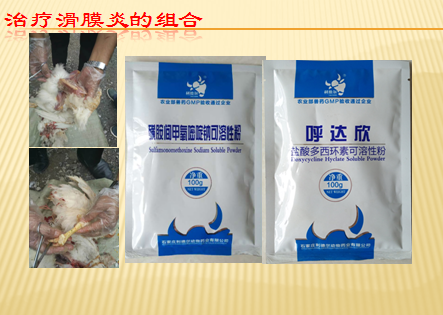 我公司專家經(jīng)過多年臨床實踐,總結(jié)出了一套非常有效的治療方案,使用呼達欣配合磺胺間甲氧嘧啶鈉可溶性粉,連用一周時間,對于控制滑膜炎效果非常好,蛋雞產(chǎn)蛋期同樣可以使用,經(jīng)本方案治療后雞群的產(chǎn)蛋高峰正常,而且基本不會復(fù)發(fā),對其他治療方案失敗的雞群依然有效。