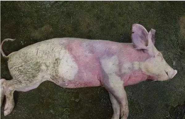 豬丹毒 : 體溫42℃以上喜臥,病初糞干,后期可能腹瀉。在胸、腹、大腿內(nèi)側(cè)、背、耳等處皮膚出現(xiàn)大小不等的紫紅色斑, 指壓褪色。呼吸困難, 可視粘膜發(fā)紺, 乳豬發(fā)病時(shí)還可出現(xiàn)角弓反張, 2~3d 死亡。亞急性型, 皮膚呈現(xiàn)不規(guī)則疹塊, 初期呈紅色, 指壓褪色, 后期變紫紅色, 指壓不褪色。慢性為心內(nèi)膜炎和關(guān)節(jié)炎, 病豬體溫正常, 生長(zhǎng)不良, 逐漸衰弱和貧血。