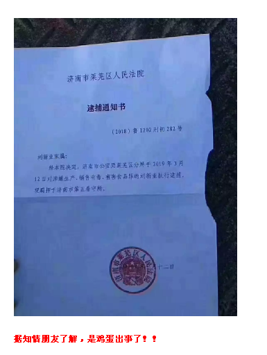 此逮捕令由濟南市萊蕪區(qū)人民法院發(fā)出,以劉新業(yè)生產、銷售有毒有害食品為由,對其執(zhí)行逮捕!