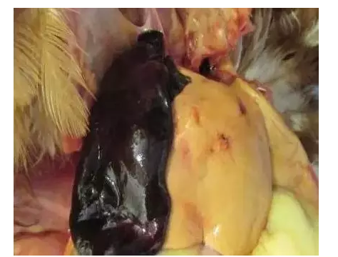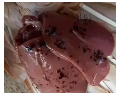 癥狀表現(xiàn):剖檢后發(fā)現(xiàn)一肚子血水、肝破裂,肝腫大、蒼白或呈土黃色,肝表面和實質(zhì)內(nèi)有黃色、星芒狀的小壞死點,布滿菜花樣的壞死區(qū),或者肝被膜下有血腫。防治措施:加強飼養(yǎng)管理,改善雞舍衛(wèi)生條件。飼料中添加肝腎康,連用3-5天。做好飼養(yǎng)管理,加強室內(nèi)帶雞消毒。