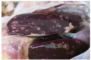 盲腸腫大、腸壁增厚,腸道內(nèi)容物變干,形成干酪樣壞死塊。肝臟腫大,表面有圓形、邊緣隆起、中間凹陷的潰瘍灶。