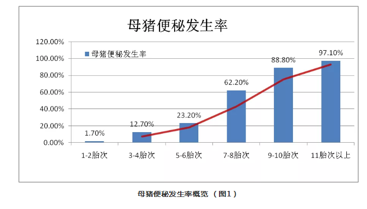 其實,母豬胎次不同便秘發(fā)生率也不同,便秘發(fā)生率隨著母豬胎次增加而增加,胎次越高,母豬便秘發(fā)生率越高,據統(tǒng)計母豬平均便秘發(fā)生率為33.4%(見圖1)。