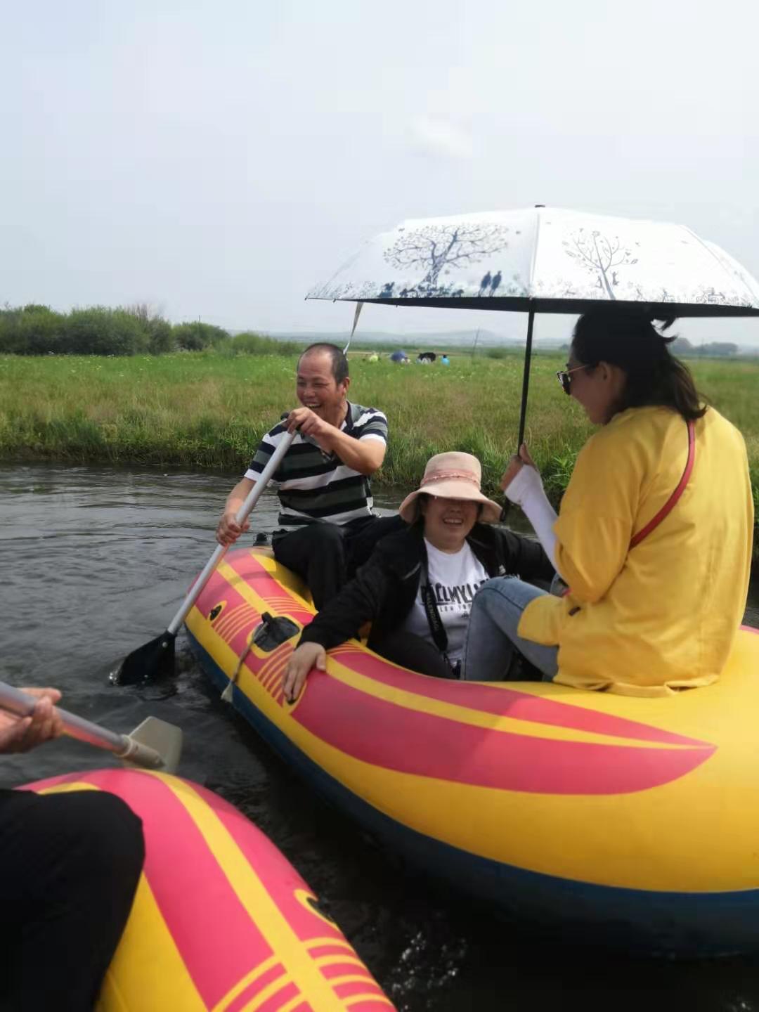 漂流開始,水流很緩,可以瀏覽沿途風(fēng)景,不經(jīng)意間貌似一盆水從天而降,原來是同事的船已靠近,用水偷襲我們,隊(duì)友開始還擊,一場水上作戰(zhàn)就此打開,原來保持矜持的尖叫,到渾身濕透的激烈反擊,一條船,兩條船,多條船,在原地打起了水仗,水花四起,后勤做飯的王姐,平日的老實(shí)人,在這里也揮起了大手掌,快速的從河里撈起水,撒向?qū)Ψ,小姑娘們招架不住,只喊投降,有的干脆跳在水里作?zhàn),尖叫聲,潑水聲,笑聲一片......,有的船只直接打翻,全部隊(duì)友掉落水里,更有船只把另一個船上的隊(duì)友直接水上劫持,拖到自己的船上去,到達(dá)岸邊,還在戀戰(zhàn),全然不顧濕透的衣服鞋子,如果不親身體驗(yàn),很難感受當(dāng)時的氣氛。接著是滑沙,坐上越野車,穿越3公里,路過駱馬湖,觀看草原湖泊的獨(dú)特美景,可以看各種稀有水鳥,來到滑沙現(xiàn)場,從沙坡上直接滑下的刺激,大人小孩,來回的往返幾次。自由滑落,驚恐中帶著神經(jīng)的刺激,伴著刺耳的尖叫聲,由上而下滑落。