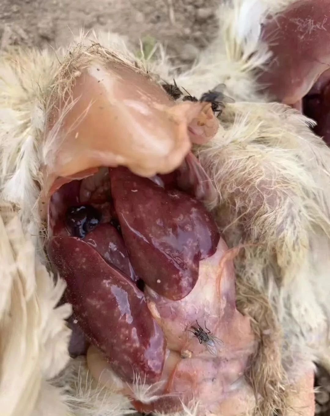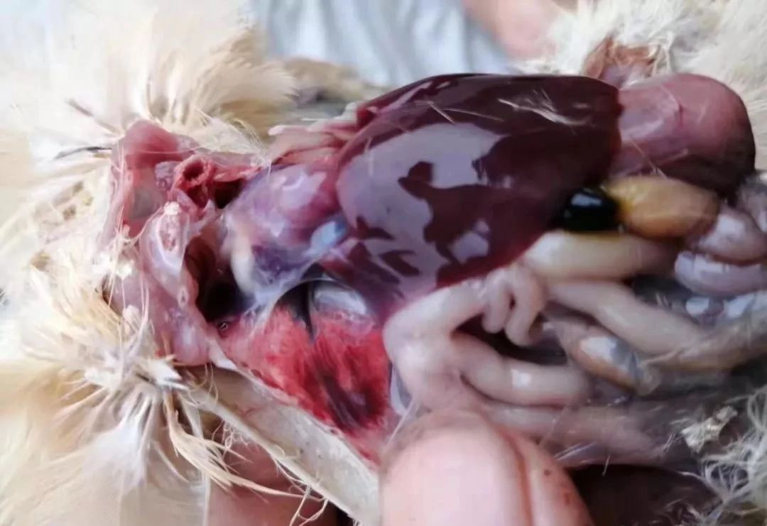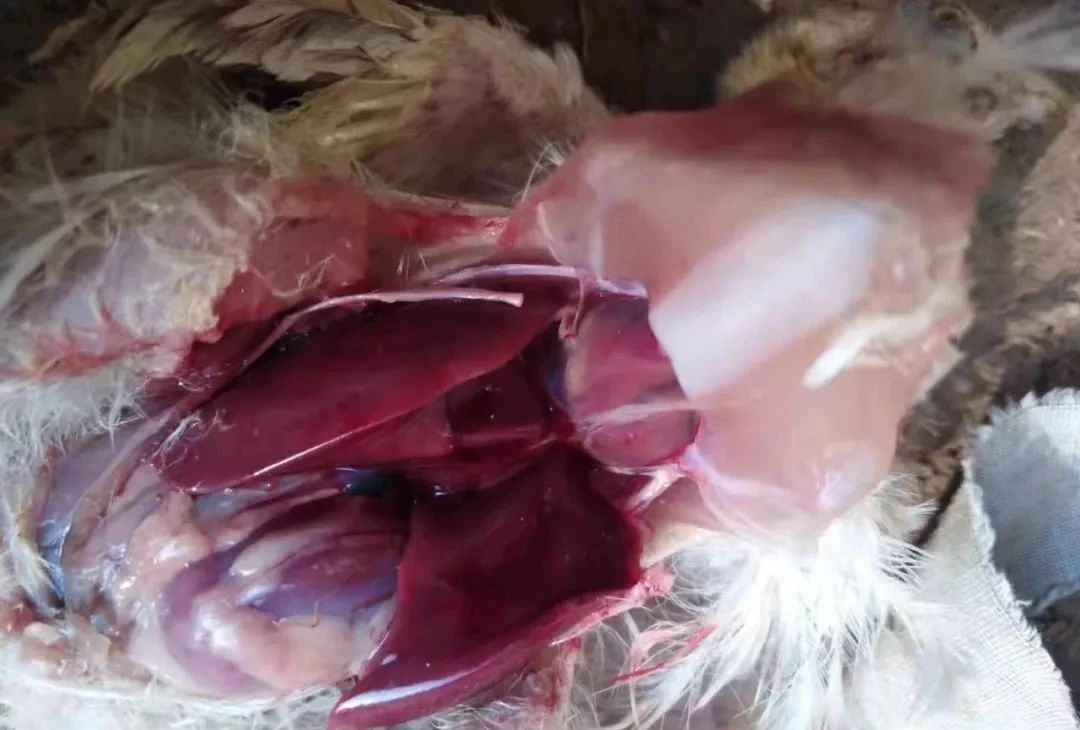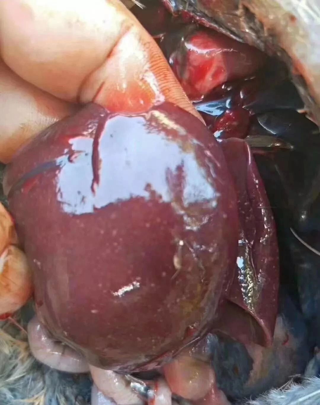 3、禽流感:肝瘀血腫大,有白色點(diǎn)狀壞死灶。產(chǎn)蛋迅速下降,死亡率較高,頭部腫脹,脛部鱗下有出血點(diǎn),腹腔內(nèi)充滿