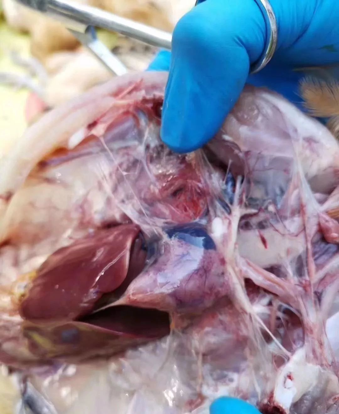 7、大腸桿菌病:肝包膜增厚,不透明呈黃白色,易剝離。在肝表面形成的這種纖維素性膜有的呈局部發(fā)生,