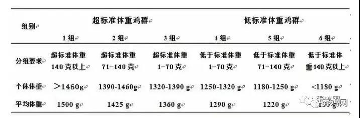 首先,以京粉1號(hào)父母代蛋種雞19周齡末的標(biāo)準(zhǔn)體重(1320克)為基礎(chǔ),以70克為分組梯度,分為6組,每組3個(gè)重復(fù),每個(gè)重復(fù)96只雞,各組雞只的體重均符合分組要求:
