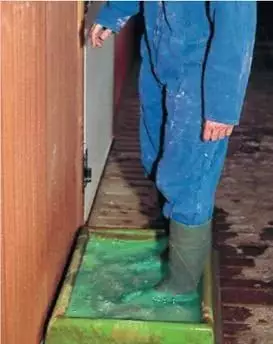 1、人員消毒,雞場(chǎng)生產(chǎn)人員是將病原微生物帶入雞場(chǎng)和雞舍的重要媒介。進(jìn)入雞場(chǎng)的工作人員要嚴(yán)格消毒,飼養(yǎng)人員不能在不同區(qū)域或不同棟舍間相互走動(dòng),工具不能相互借用。工作人員在工作結(jié)束后,必須先消毒再離開,工作服不準(zhǔn)穿出工作區(qū)。清洗后的服裝用紫外線或熏蒸消毒,必須堅(jiān)持三踩一更的消毒制度。場(chǎng)區(qū)門前踩3%火堿消毒池,更衣室洗手更衣,生產(chǎn)區(qū)門前踩消毒池,雞舍門前踩消毒池,消毒好后才可入雞舍。