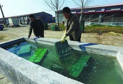2、用具和物品的消毒。將用具、雞蛋箱、飲水器、料槽等先搬到戶外清洗,用0.1%-0.5%過氧乙酸溶液浸泡或噴灑消毒。