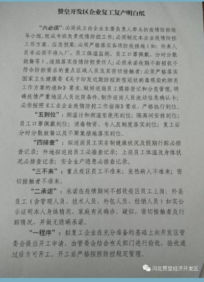 隨著春節(jié)假期結束,企業(yè)復工在即,防控疫情攻堅戰(zhàn)依然持續(xù)。為促進園區(qū)各企業(yè)盡快復工,贊皇經(jīng)濟開發(fā)區(qū)總結了企業(yè)復工復產(chǎn)應做的各項工作,并印發(fā)了企業(yè)復產(chǎn)復工明白紙,希望各企業(yè)切實按要求執(zhí)行,盡快安全有序復工。