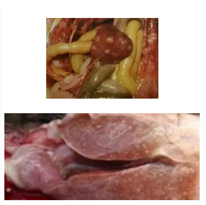 剖檢病鴨見肝臟腫大,脾臟壞死,胰腺有針尖到米粒大小散在白色壞死點(diǎn),心肌和脂肪出血。一般情況下,也能見到肝臟有出血點(diǎn)或斑、壞死,脾腫大、有白色壞死點(diǎn),肺臟出血,腎臟蒼白且有出血點(diǎn)和壞死點(diǎn)等。(見圖1)