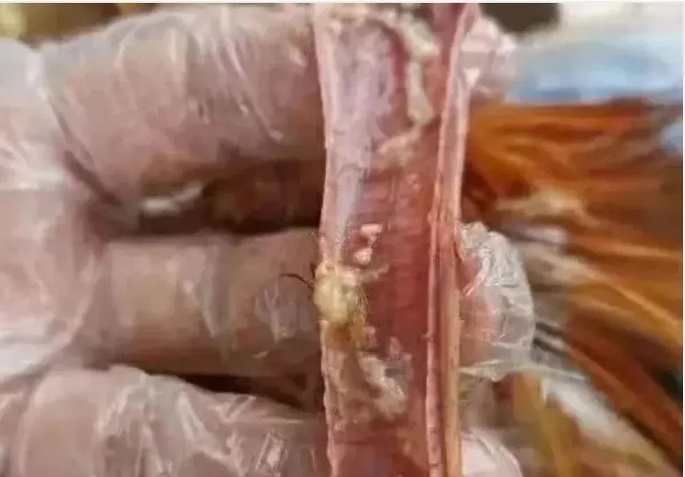 病雞典型癥狀是張口伸脖、“咳血”、拉長音、怪叫,俗稱“來回音”。急性病例呈現(xiàn)明顯的呼吸困難,咳出帶血的黏液掛在雞籠上或甩在地面上。慢性病例喉頭有淡黃色干酪物堵塞,常死于窒息。